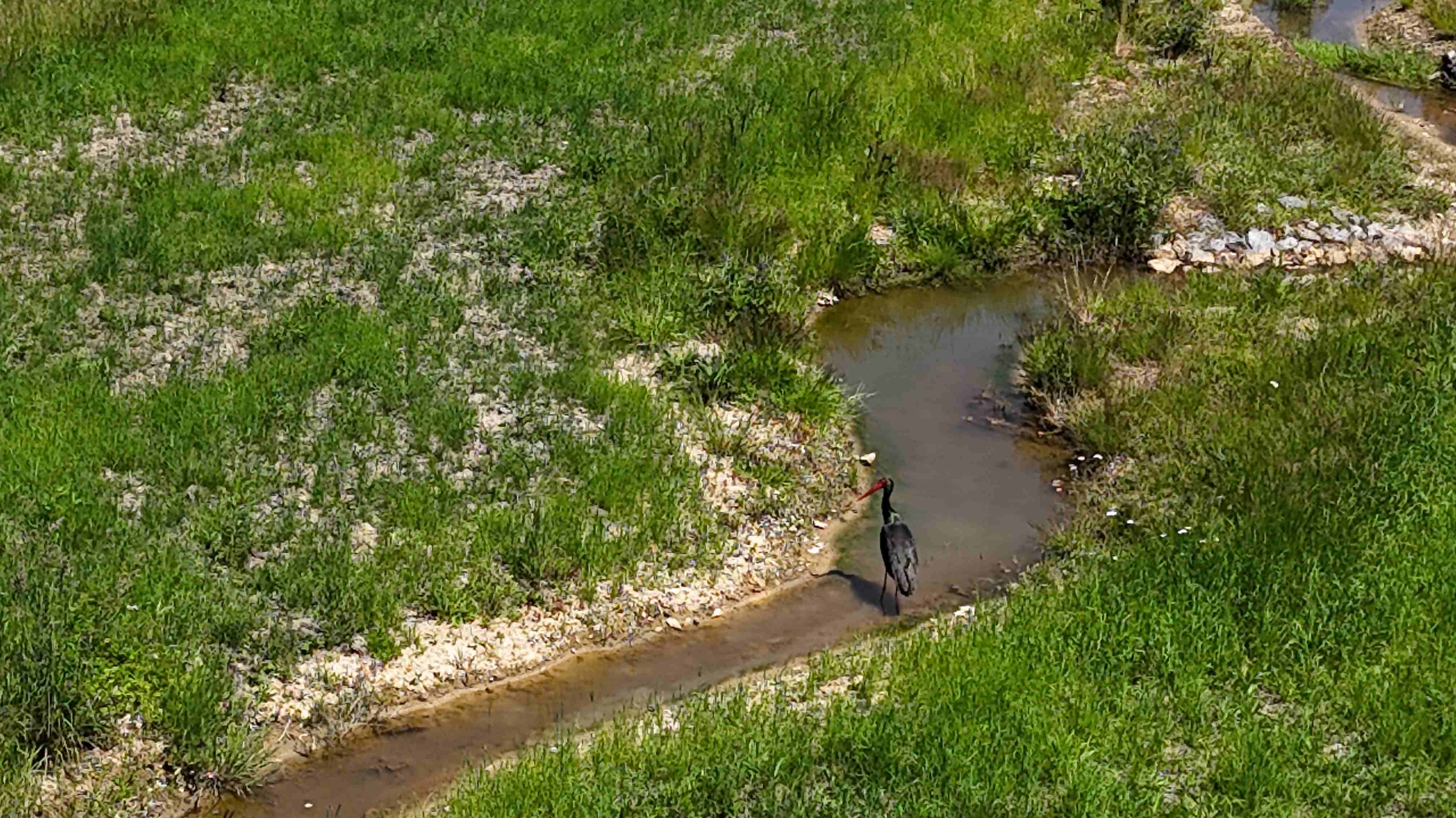 - čápa černého jsme u meandrujícího koryta toku zachytili ještě během stavby – červen 2025
