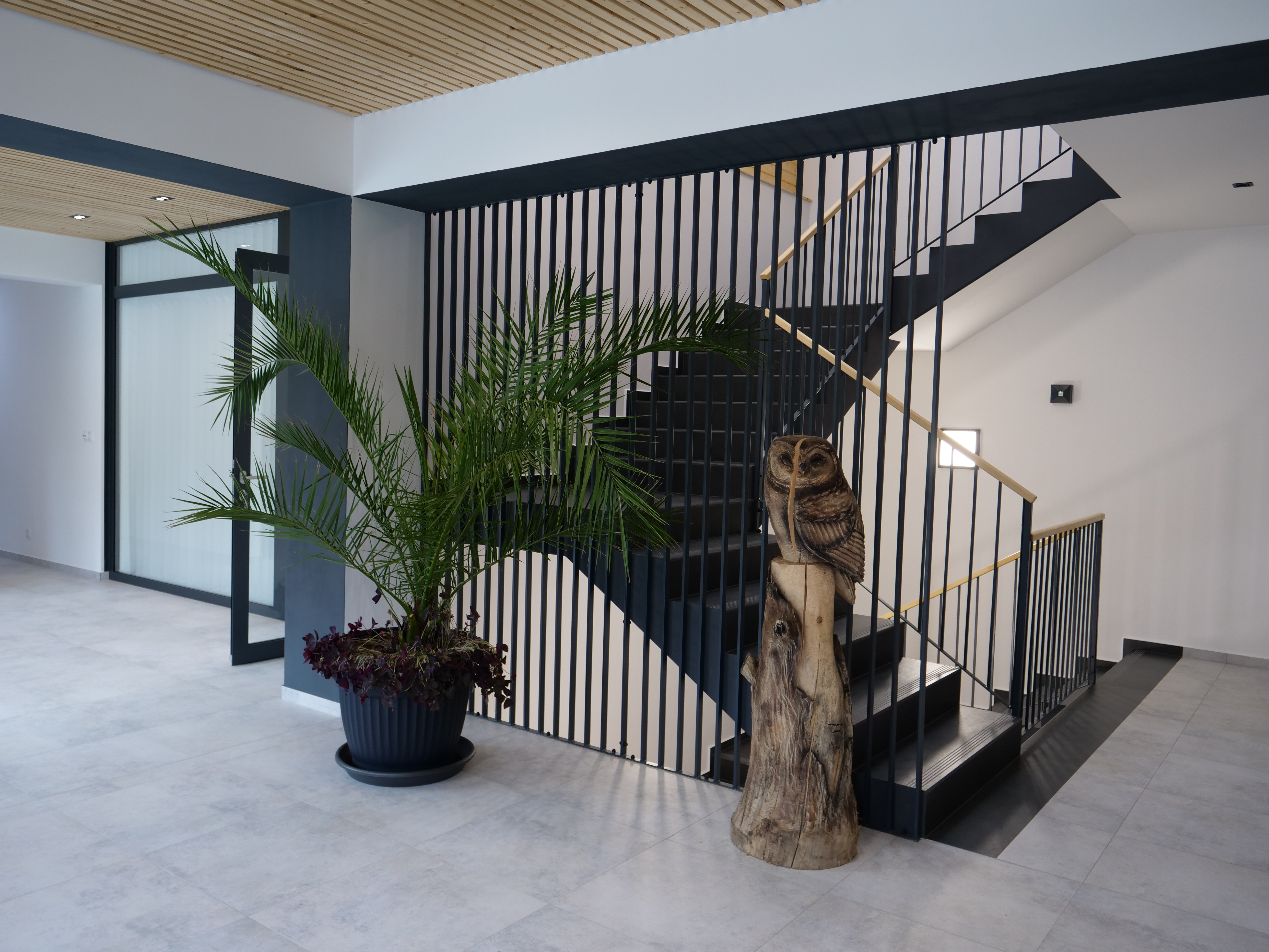 Na zpevněné ploše jsou chodníky a 23 parkovacích stání, k nimž přibydou ještě dvě nabíjecí stanice pro elektromobily. Budovu vytápí tepelná čerpadla, na střeše se počítá s fotovoltaikou.