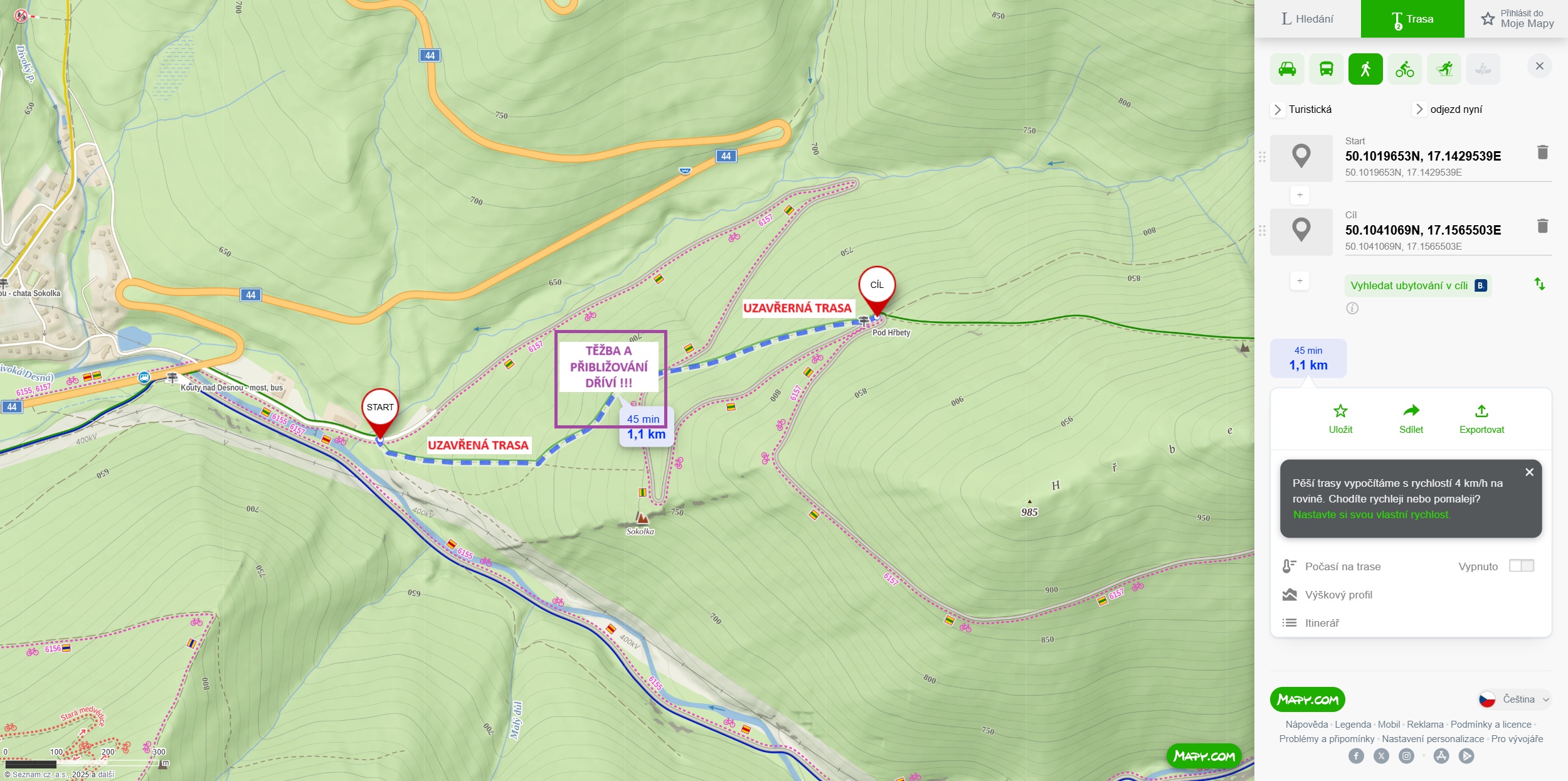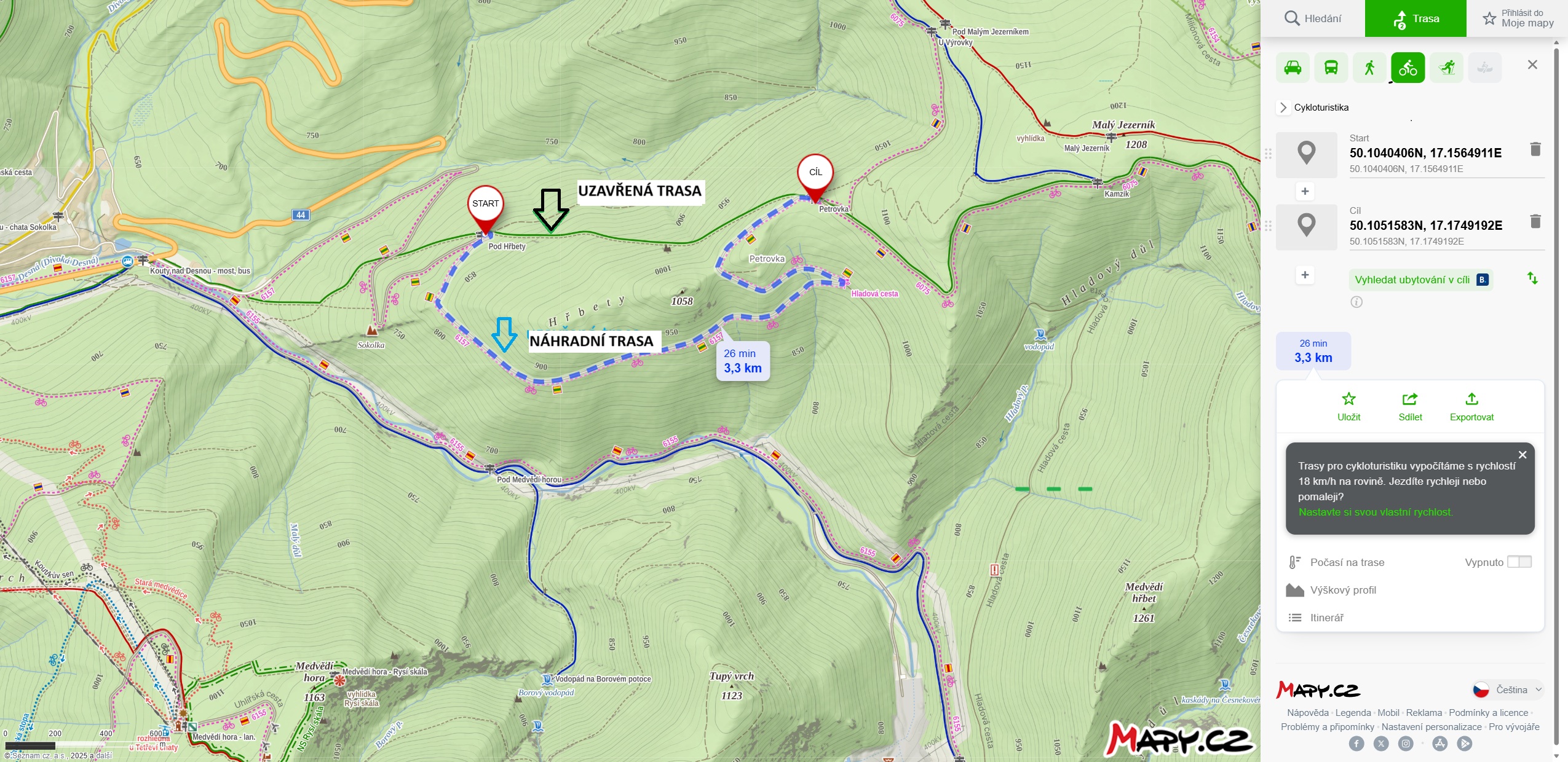 Téměř 1,5 kilometrů dlouhý úsek zeleně značené turistické trasy mezi jesenickými rozcestími „Pod Hřbety“ a „Petrovka“ a další asi kilometrový úsek mezi rozcestníky „Pod Hřbety“ a „Kouty nad Desnou“ budou pro veřejnost do 20. prosince kvůli bezpečnosti uzavřené. V místě se těží a dříví přibližuje lanovka. Děkujeme za pochopení.