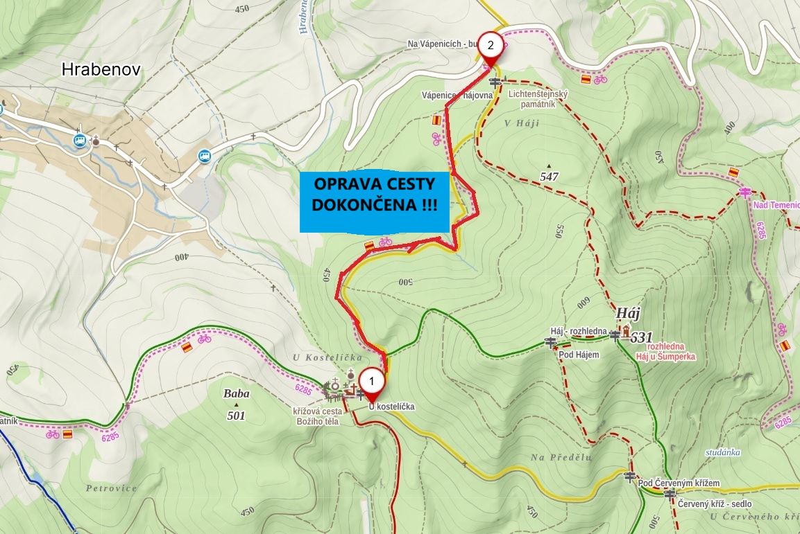 Skoro jako nová je po opravě za šest a půl milionu korun lesní cesta Ke Kostelíčku nad Hrabenovem na Šumpersku se značenou turistickou stezkou a cyklotrasou „K řece Moravě“. Dříve tvořily její povrch propustné hutněné materiály, nyní je to mechanicky zpevněné kamenivo, které lépe odolá zátěži, a to zejména při odvozu dříví. Nový povrch všichni ocení hlavně po dešti😊.