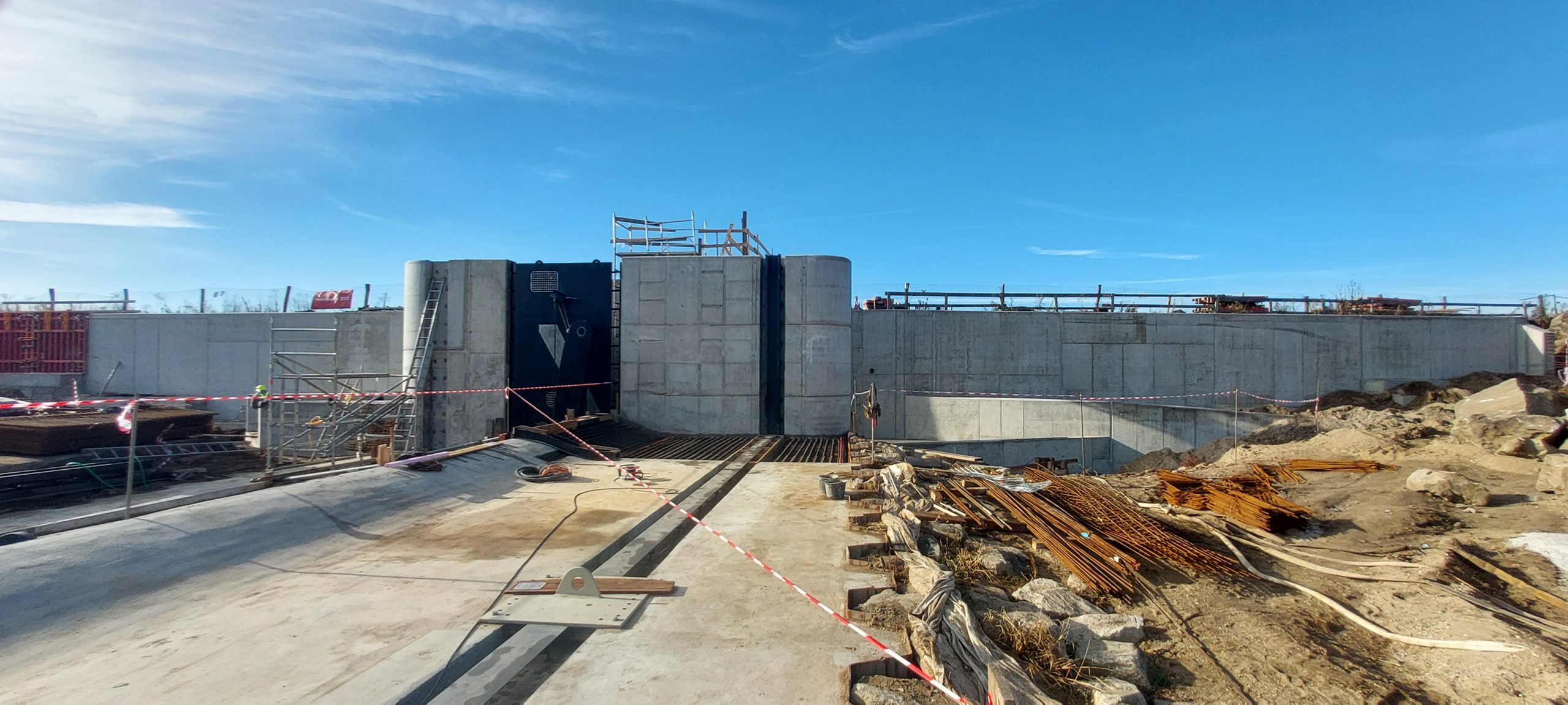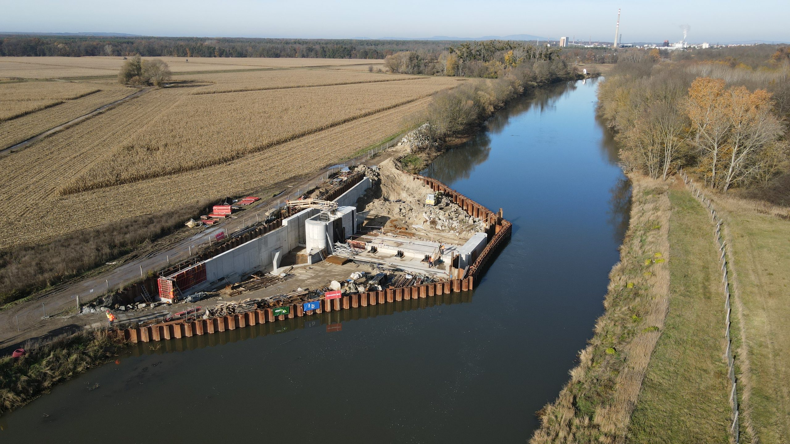 Práce na samotném jezu ovlivnily zejména loňské vysoké stavy vody v Dyji, včetně těch povodňových. Aktuálně jsou dokončené betonáže pravobřežního a středového pilíře včetně migrační propusti. Vyrobené jsou i dvě třiadvacet metrů dlouhé klapky. Každá z nich váží 35 tun. Ty jsou i kvůli bočnímu ovládání technickým unikátem. „První z klapek nyní osazujeme. Následně s ní bude možné samostatně manipulovat. Druhou klapku osadíme na podzim příštího roku a v letech 2027 a 2028 počítáme se zkušebním provozem jezu. Klapky budou po většinu roku sklopené u dna a za běžných průtoků je v řece ani nezaznamenáte. Zajistíme tak kontinuitu vodního toku i jeho migrační prostupnost. Během případného záměrného povodňování klapky zvedneme o 2,3 metry a s nimi i hladinu řeky nad jezem. Do území Soutoku tak bude možné napustit za deset či dvanáct dnů až deset milionů metrů krychlových vody,“ uzavřel téma Pavel Hopjan, vedoucí Správy toků pro oblast povodí Dyje z Lesů ČR.