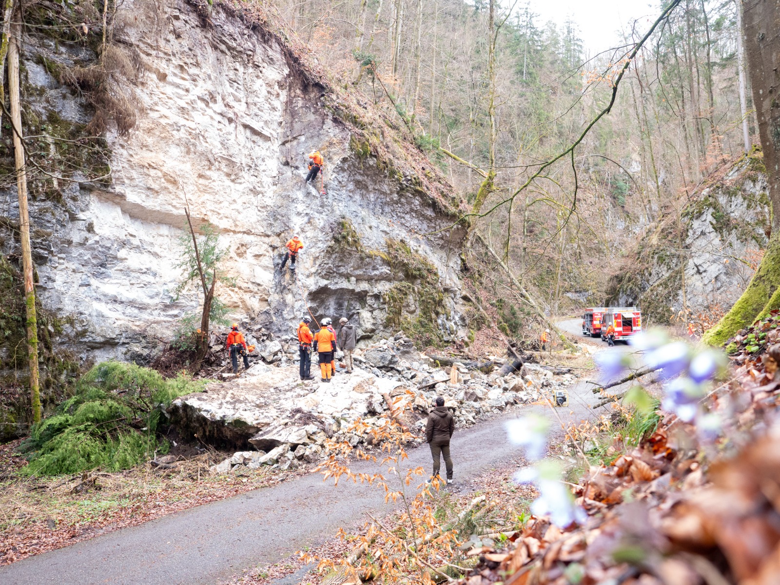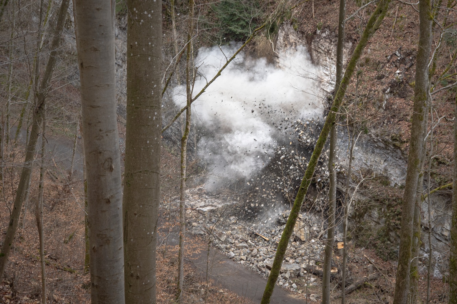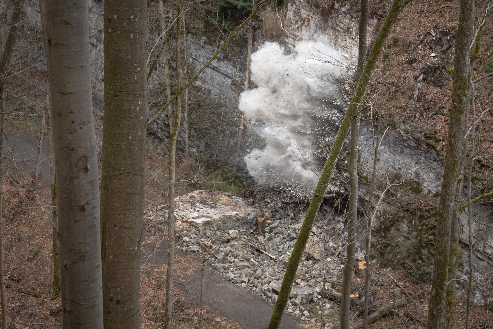 Asi dvacet tun vápence leží po včerejším zásahu Hasičského záchranného sboru Jihomoravského kraje a policejních pyrotechniků pod východní stěnou Pustého žlebu v Moravském krasu. „Střelmistři a specialisté na práci ve výškách se nejdřív pokusili odstranit rizikový skalní blok mechanicky pomocí pneumatických vaků a zvedacích hydraulických nástrojů využívaných třeba u dopravních nehod. Nepodařilo se, takže nakonec oddělily uvolněné části vápence od svahu dvě nálože průmyslové trhaviny,“ uvedl Martin Sedláček, technik z jihomoravského oblastního ředitelství Lesů ČR. S úklidem kamene se začne příští týden, na Velikonoce už by měla být cesta žlebem průchozí bez omezení.