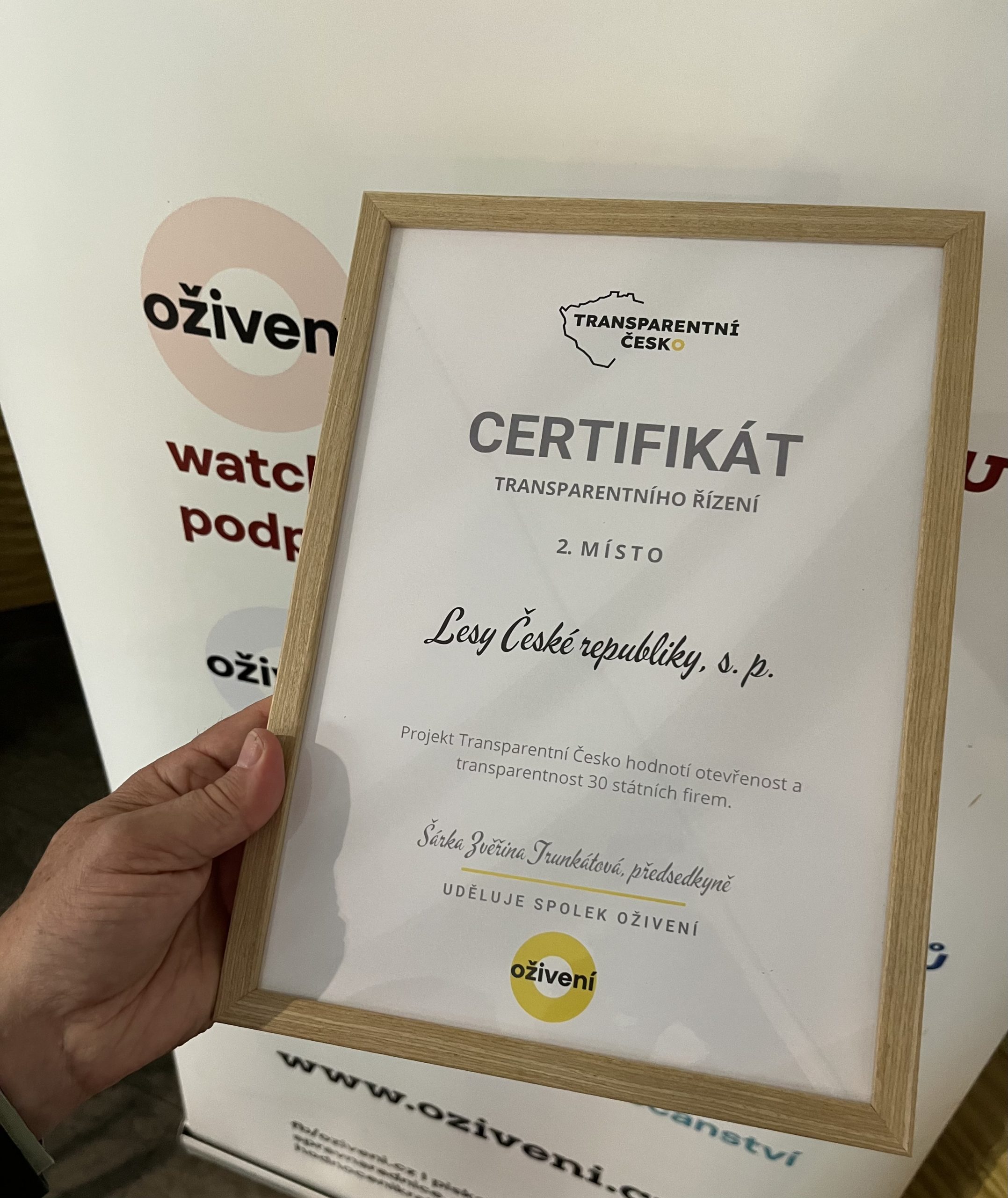 Za transparentnost dnes také Lesy ČR ocenil spolek Oživení, který letos analyzoval 30 největších státních firem a veřejnou dostupnost informací o jejich činnosti i plnění úkolů státu. Lesy ČR získaly certifikát spojený s druhým místem. Více na www.oziveni.cz.