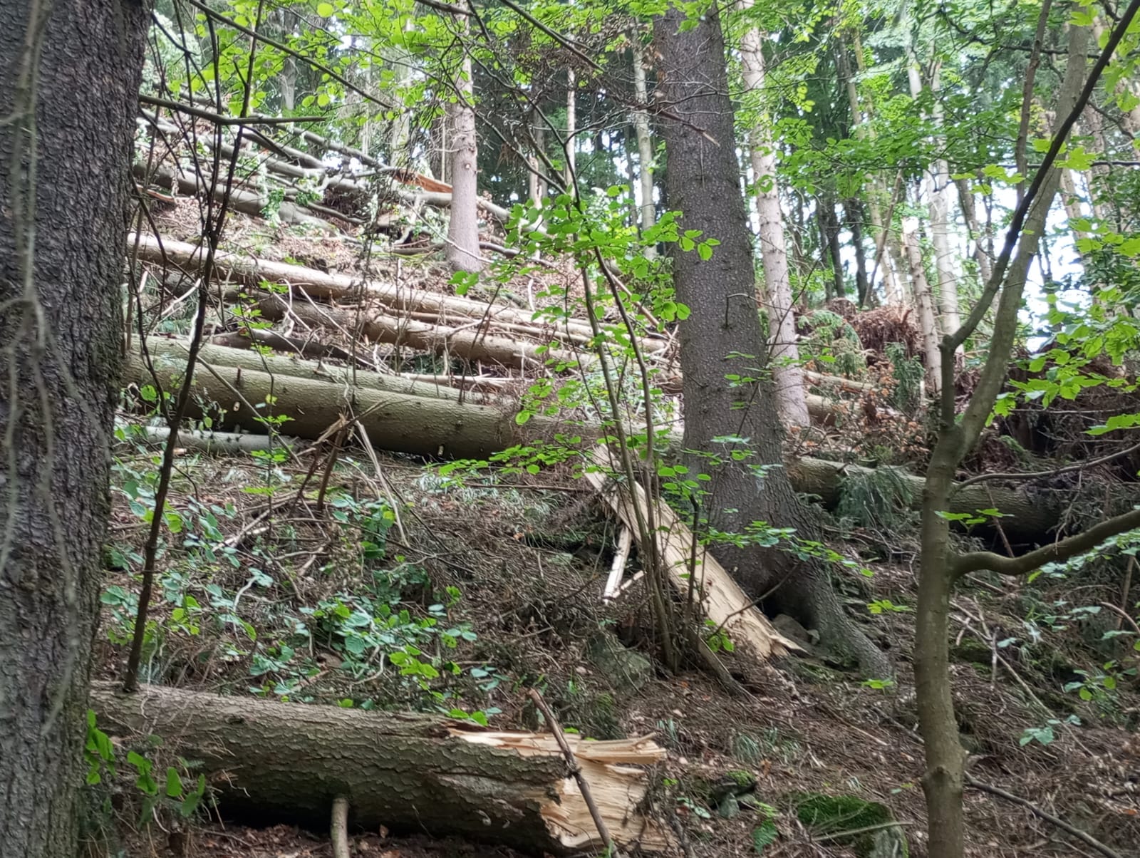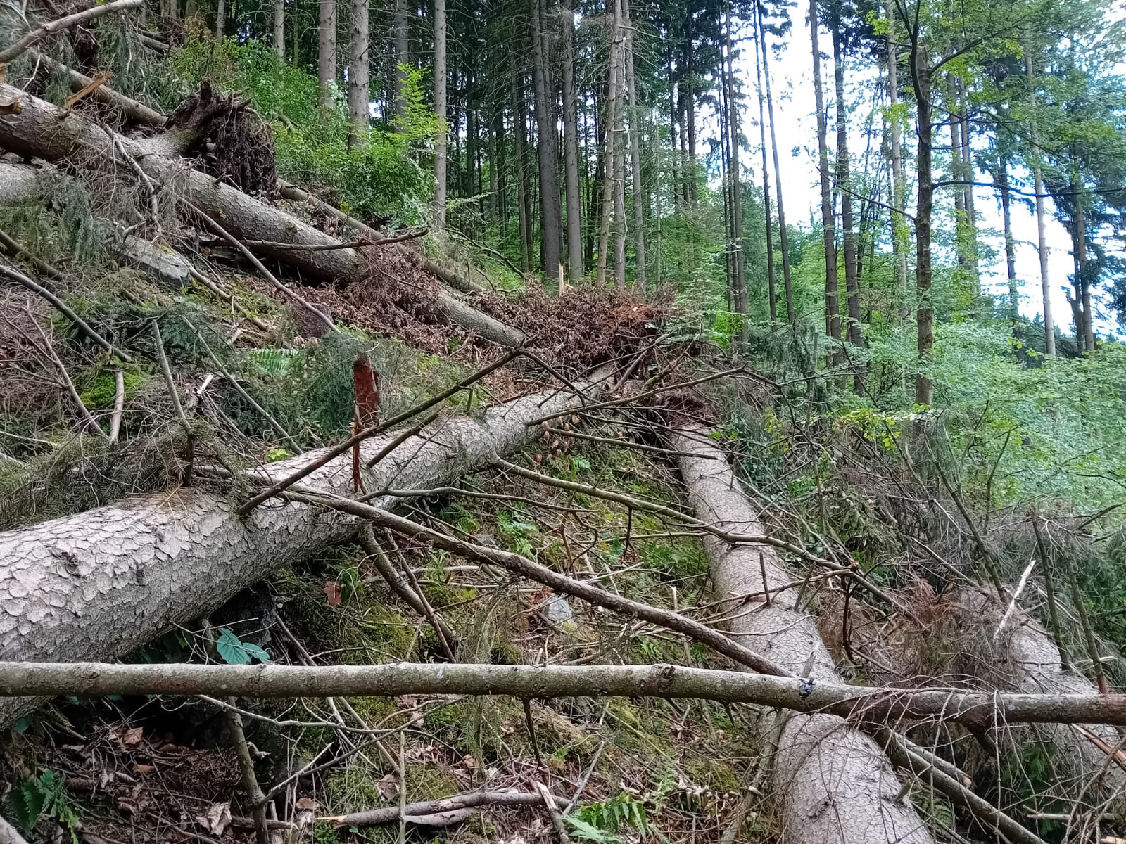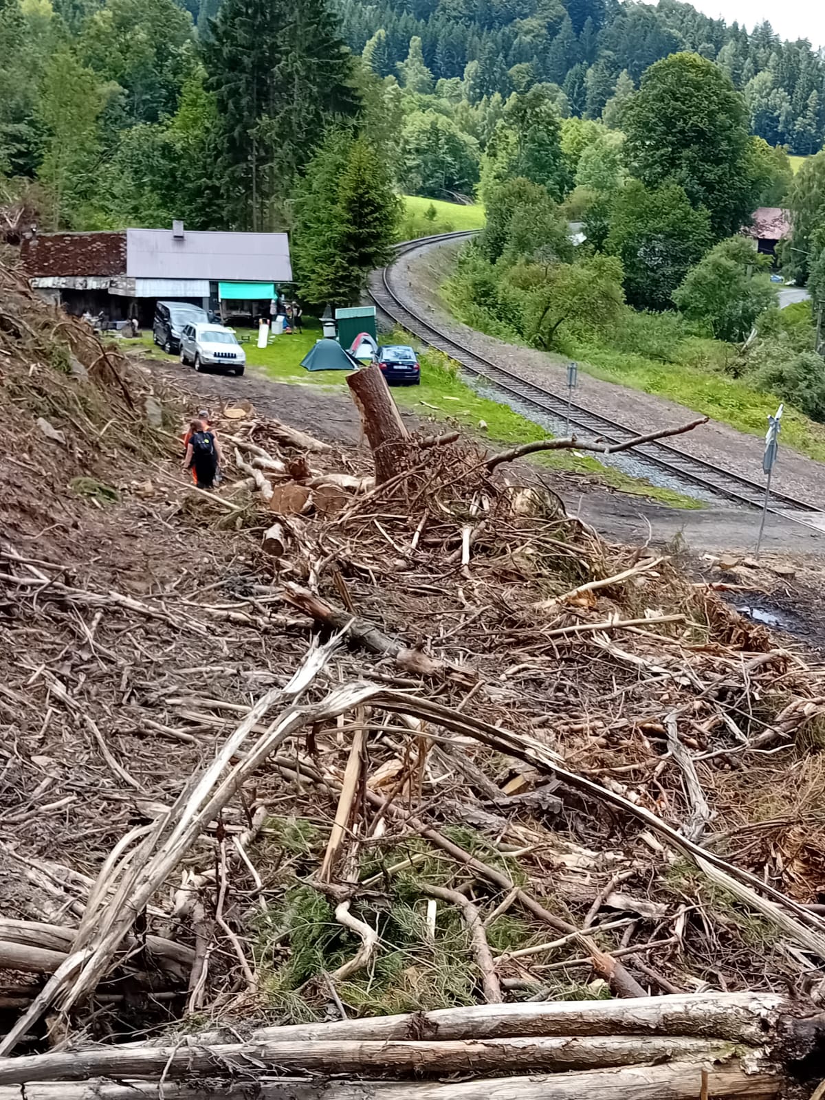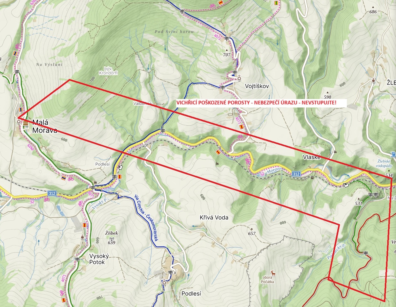 Tisíce stromů zlomených, vyvrácených a nalomených červencovou vichřicí právě zpracovávají Lesy ČR v údolí obklopeném strmými svahy v okolí Malé Moravy a osady Vlaské na Šumpersku v Olomouckém kraji. V oblasti není bezpečno, na zem dopadávají velké větve i kmeny, dříví se těží a odváží. „Nevydávejte se po zelené trase od železniční stanice Vlaské k Zámečku u Hanušovic ani směrem na Vršavu. Pozor taky na cyklostezce číslo 4071 a na modré pěší trase od Vysokého Potoka do Vojtíškova,“ upozorňuje Ivo Valenta, lesní správce z Rudy nad Moravou. „Likvidace následků vichřice je v tomto terénu náročná a nějakou dobu potrvá. Z pěti tisíc kubíků jsme už tři a půl tisíce zpracovali. Kvůli bezpečnosti na trati spolupracujeme i se Správou železnic,“ dodává správce a nedoporučuje lidem, aby se tam vydávali po značených i neznačených cestách.