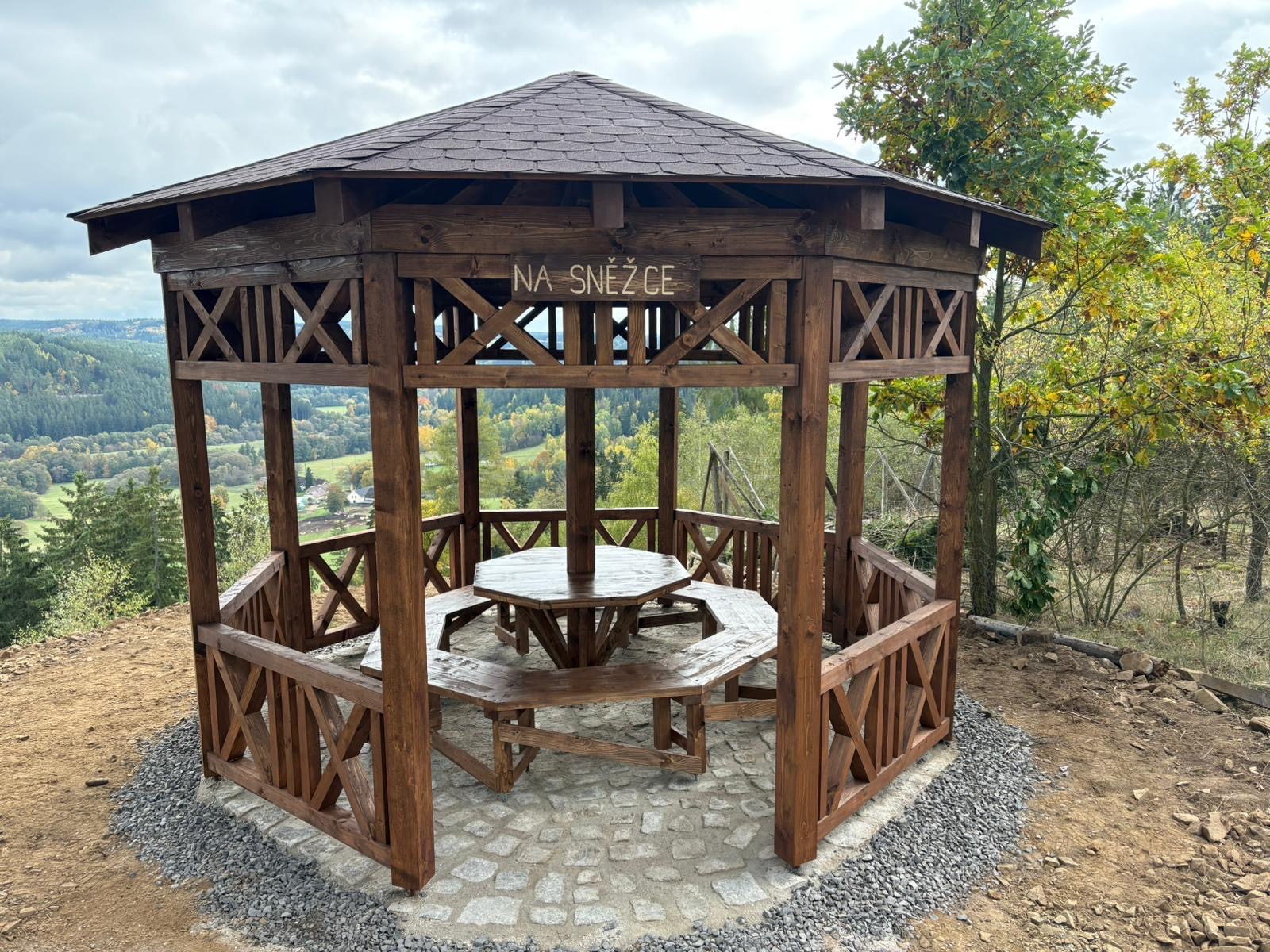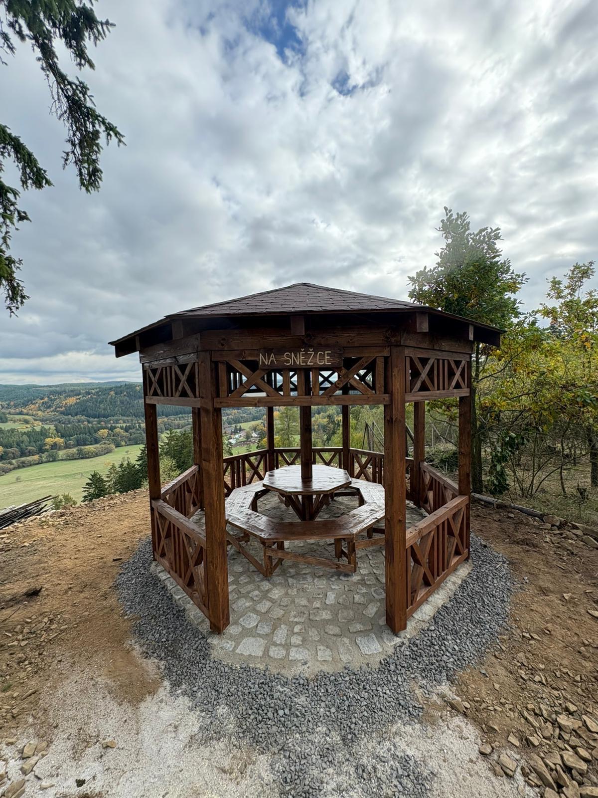 Kruhový altán ze smrkového dřeva se stolem a lavicemi za bezmála 180 tisíc korun právě nad údolím řeky Střely v západních Čechách dokončily Lesy České republiky. Z překrásného místa je vidět i na obce Poříčí, Luby a směrem na Rabštejn. Podlaha odpočívadla je z lomového kamene zalitého do betonu, střechu pokrývá asfaltový šindel. Podle revírníka Tomáše Vojíka z Lesní správy Toužim, který místo vytipoval, se tam říká na Sněžce podle výhledu do krajiny i kamenitého svahu pod altánem. Parkovat je možné na polní cestě kousek od vrchu “Nad Střelou“ a odtud dojít pěšky k vyhlídkovému místu Chyše, které je označené na portále Mapy.cz – https://mapy.com/s/gemugurama.